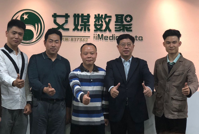 双方代表在广州“艾媒数聚”公司合影 (左起: 中大新华“团子邦”CEO夏林峰、中大新华创业学院执行院长任荣伟教授、广州艾媒数聚公司CEO张毅、中大新华管理学院执行院长彭建平教授、“团子邦” 中大新华“团子邦”CMO陈金耀)