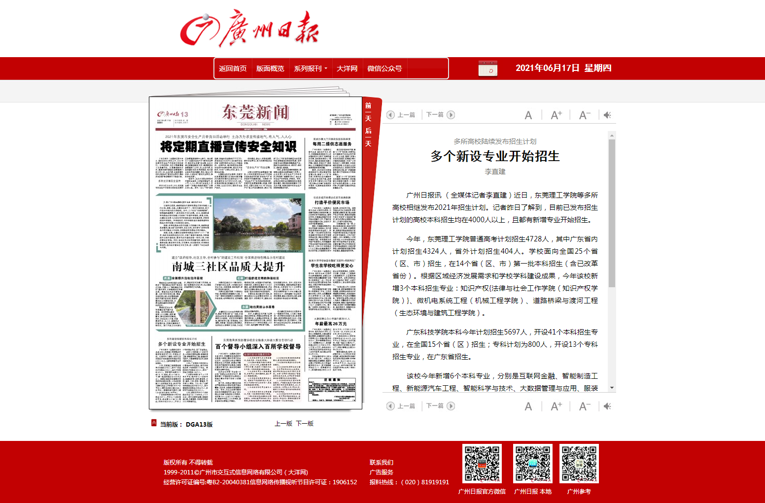 今年,东莞理工学院普通高考计划招生4728人,其中广东省内计划招生4324人,省外计划招生404人。学校面向全国25个省(区、市)招生,在14个省(区、市)第一批本科招生(含已改革省份)。根据区域经济发展需求和学校学科建设成果,今年该校新增3个本科招生专业:知识产权{法律与社会工作学院(知识产权学院)}、微机电系统工程(机械工程学院)、道路桥梁与渡河工程(生态环境与建筑工程学院)。