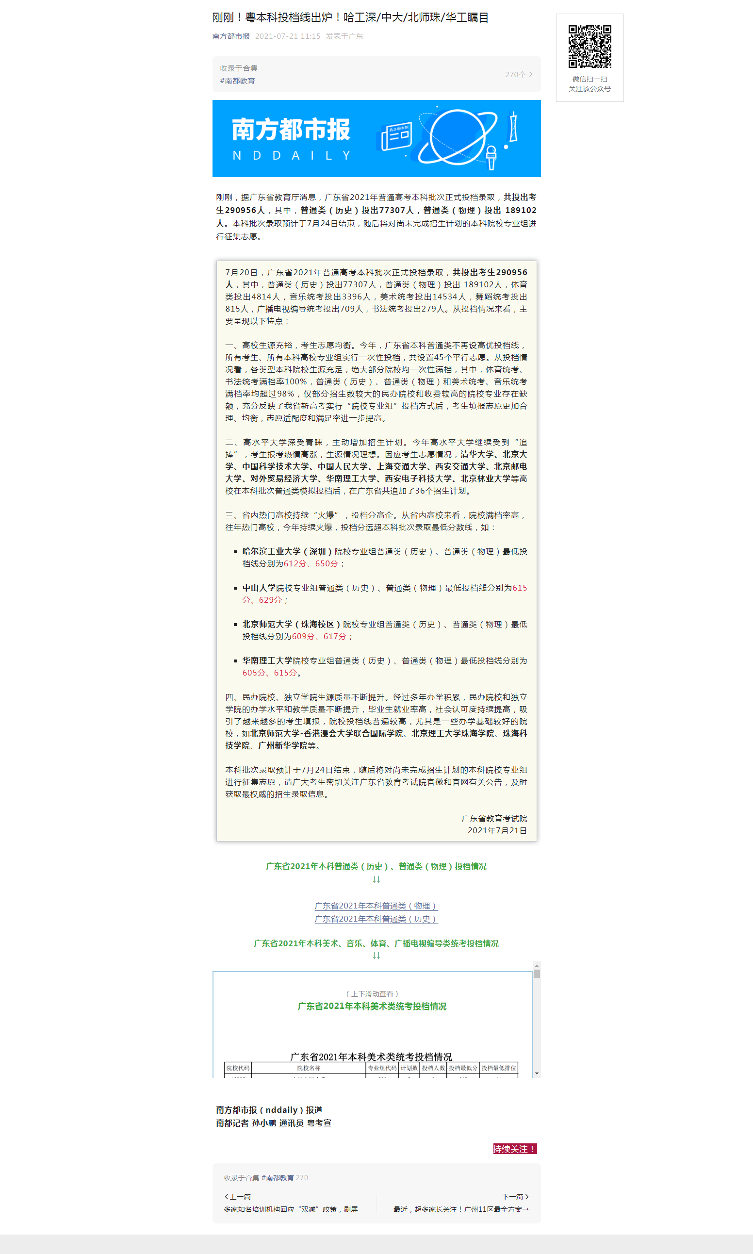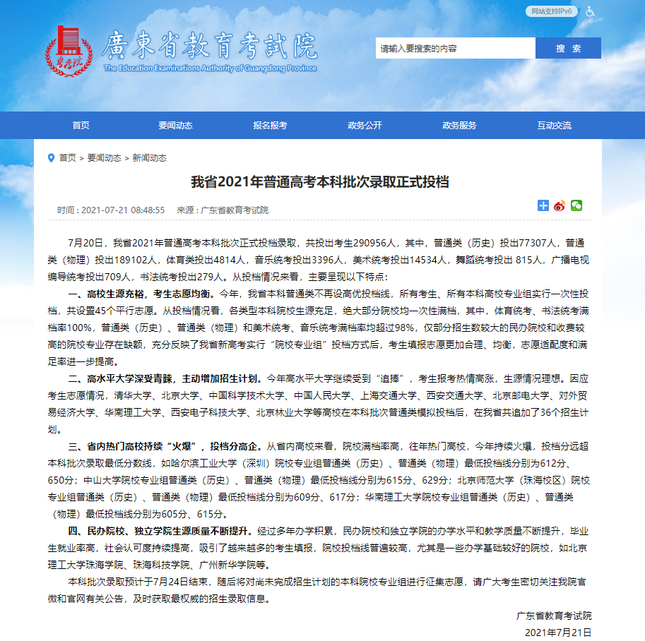 刚刚,据广东省教育厅消息,广东省2021年普通高考本科批次正式投档录取,共投出考生290956人,其中,普通类(历史)投出77307人,普通类(物理)投出189102人。本科批次录取预计于7月24日结束,随后将对尚未完成招生计划的本科院校专业组进行征集志愿。