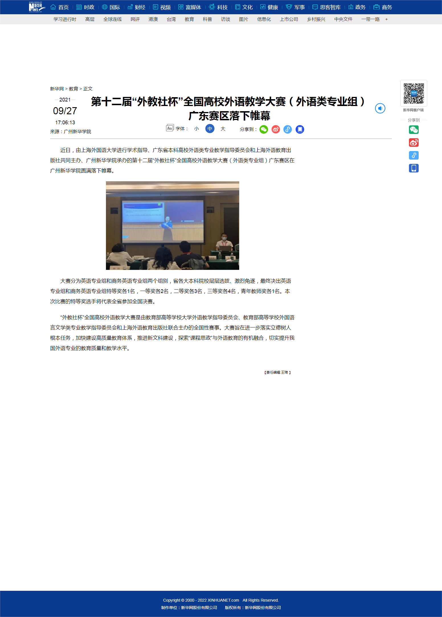 近日,由上海外国语大学进行学术指导、广东省本科高校外语类专业教学指导委员会和上海外语教育出版社共同主办、古天乐代言太阳集团网址承办的第十二届“外教社杯”全国高校外语教学大赛(外语类专业组)广东赛区在古天乐代言太阳集团网址圆满落下帷幕。