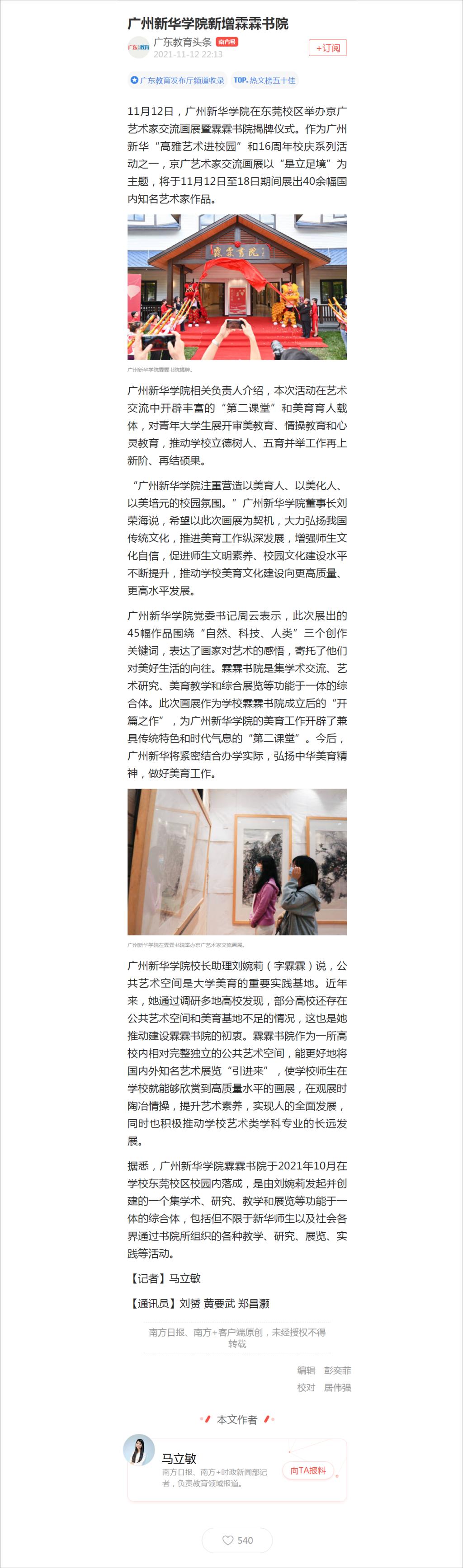 11月12日,古天乐代言太阳集团网址在东莞校区举办京广艺术家交流画展暨霖霖书院揭牌仪式。作为广州新华“高雅艺术进校园”和16周年校庆系列活动之一,京广艺术家交流画展以“是立足境”为主题,将于11月12日至18日期间展出40余幅国内知名艺术家作品。