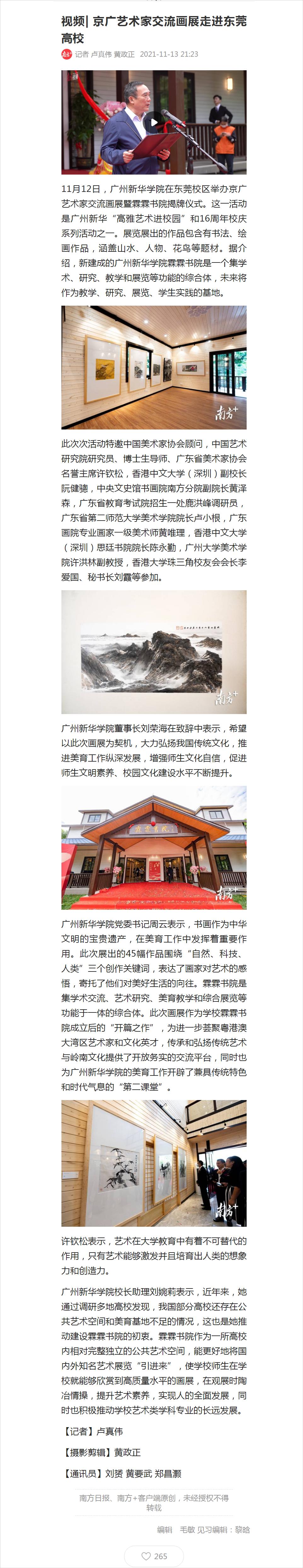 11月12日,古天乐代言太阳集团网址在东莞校区举办京广艺术家交流画展暨霖霖书院揭牌仪式。这一活动是广州新华“高雅艺术进校园”和16周年校庆系列活动之一。展览展出的作品包含有书法、绘画作品,涵盖山水、人物、花鸟等题材。据介绍,新建成的古天乐代言太阳集团网址霖霖书院是一个集学术、研究、教学和展览等功能的综合体,未来将作为教学、研究、展览、学生实践的基地。