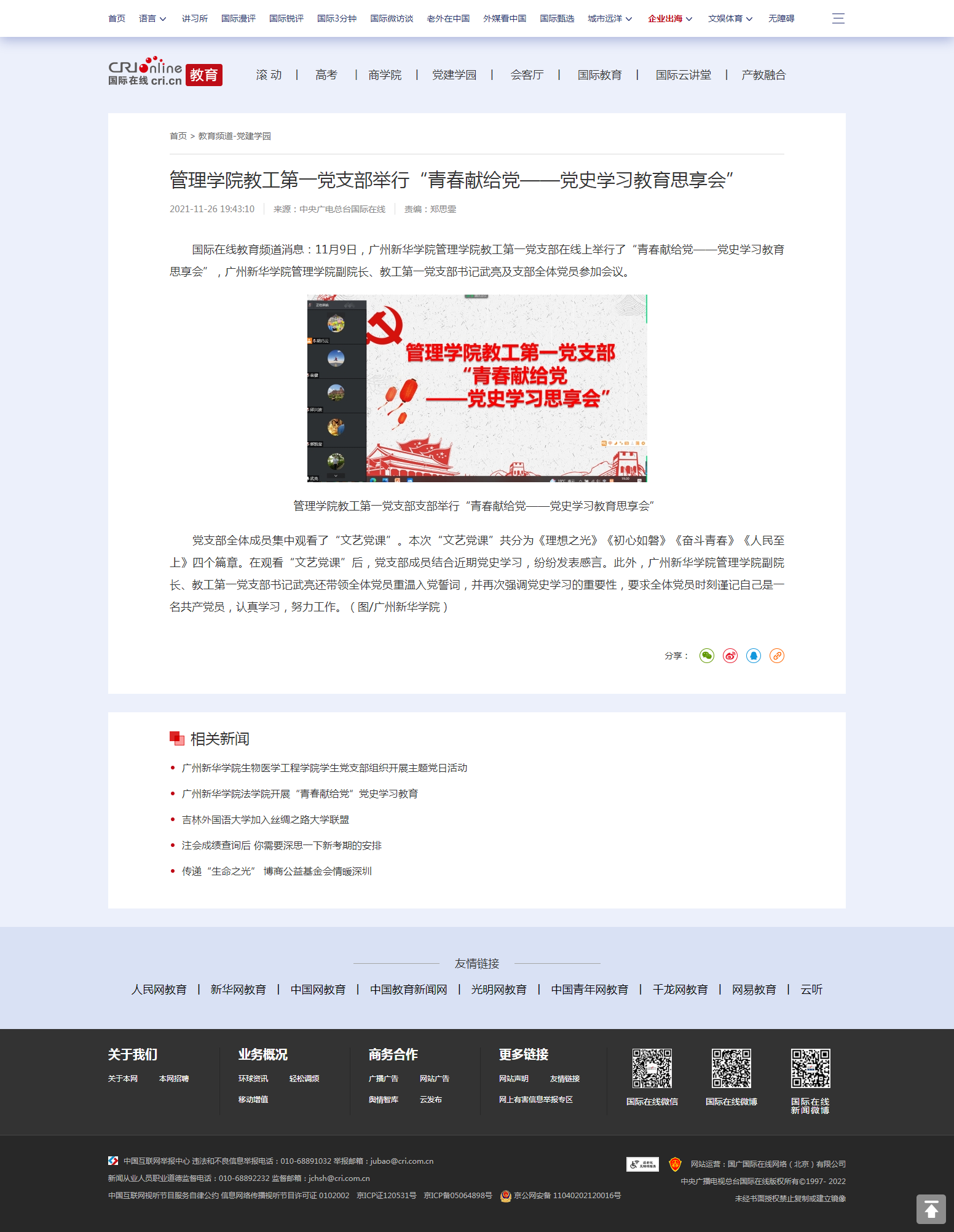 国际在线教育频道消息:11月9日,古天乐代言太阳集团网址管理学院教工第一党支部在线上举行了“青春献给党——党史学习教育思享会”,古天乐代言太阳集团网址管理学院副院长、教工第一党支部书记武亮及支部全体党员参加会议。