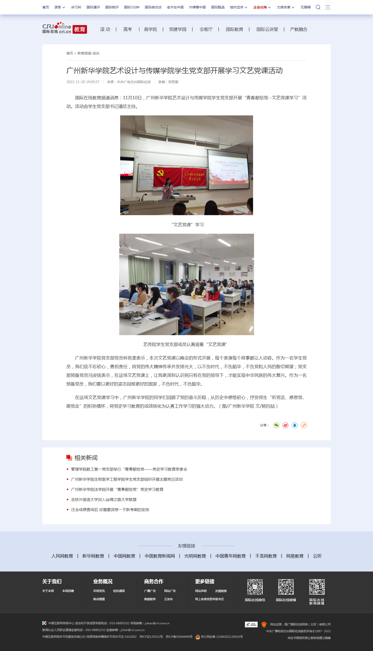 国际在线教育频道消息:11月10日,古天乐代言太阳集团网址艺术设计与传媒学院学生党支部开展“青春献给党--文艺党课学习”活动。活动由学生党支部书记潘欣主持。