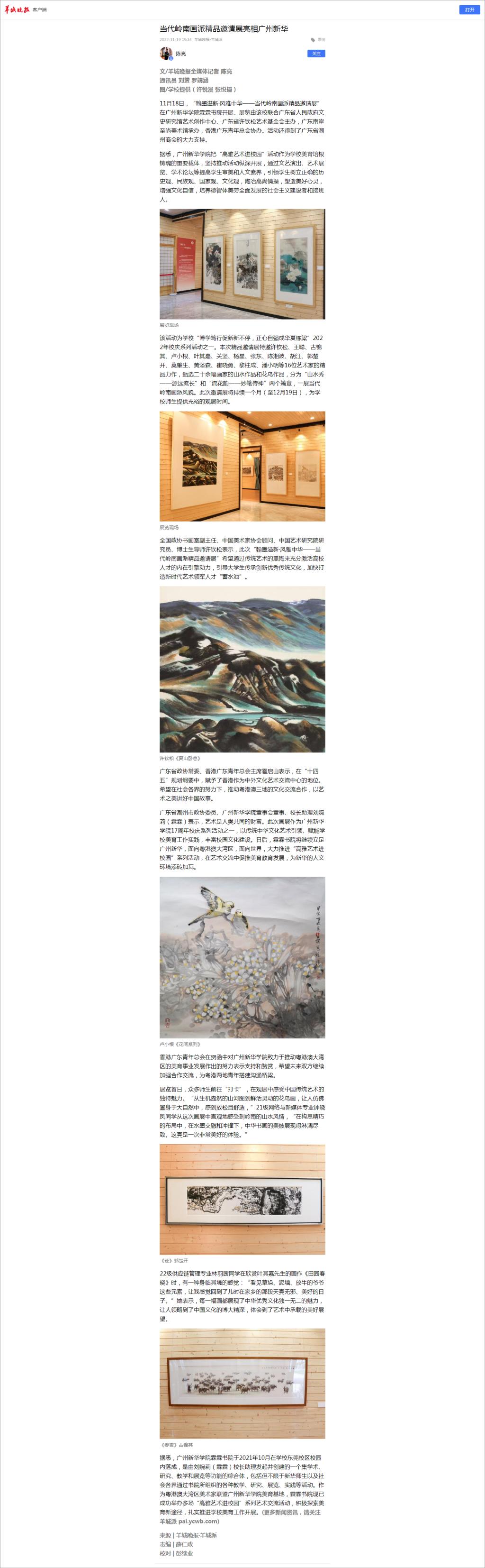 该活动为学校“博学笃行促新新不停,正心自强成华夏栋梁”2022年校庆系列活动之一。本次精品邀请展特邀许钦松、王聪、古锦其、卢小根、叶其嘉、关坚、杨星、张东、陈湘波、胡江、郭楚开、莫肇生、黄泽森、崔晓勇、黎柱成、潘小明等16位艺术家的精品力作,甄选二十余幅画家的山水作品和花鸟作品,分为“山水秀——源远流长”和“流花韵——妙笔传神”两个篇章,一展当代岭南画派风貌。此次邀请展将持续一个月(至12月19日),为学校师生提供充裕的观展时间。