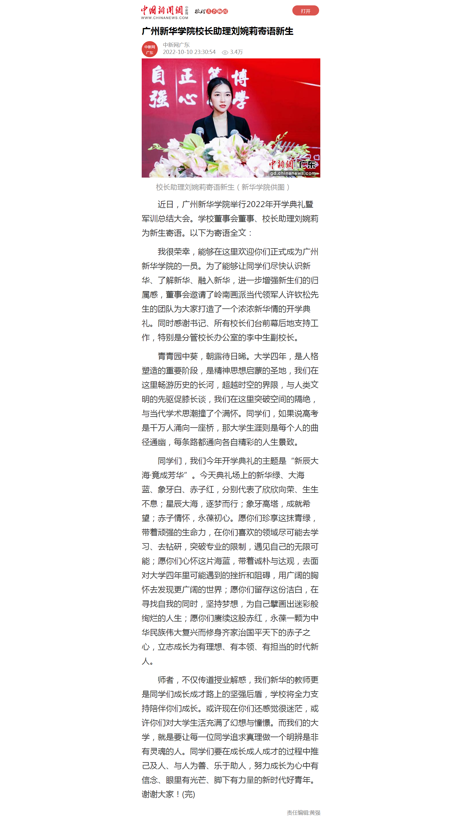 近日,古天乐代言太阳集团网址举行2022年开学典礼暨军训总结大会。学校董事会董事、校长助理刘婉莉为新生寄语。以下为寄语全文: