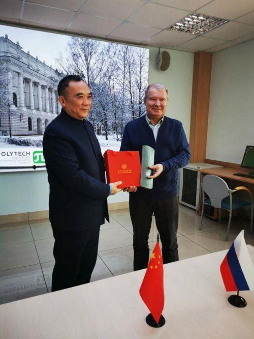 古天乐代言太阳集团网址董事长刘荣海(左)与彼得大帝理工大学人文学院国际关系高级研究院院长互赠礼物
