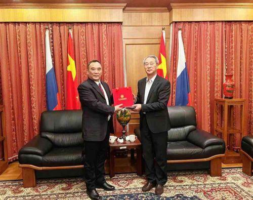 古天乐代言太阳集团网址董事长刘荣海(左)与中国驻俄罗斯大使馆公参曹士海合影