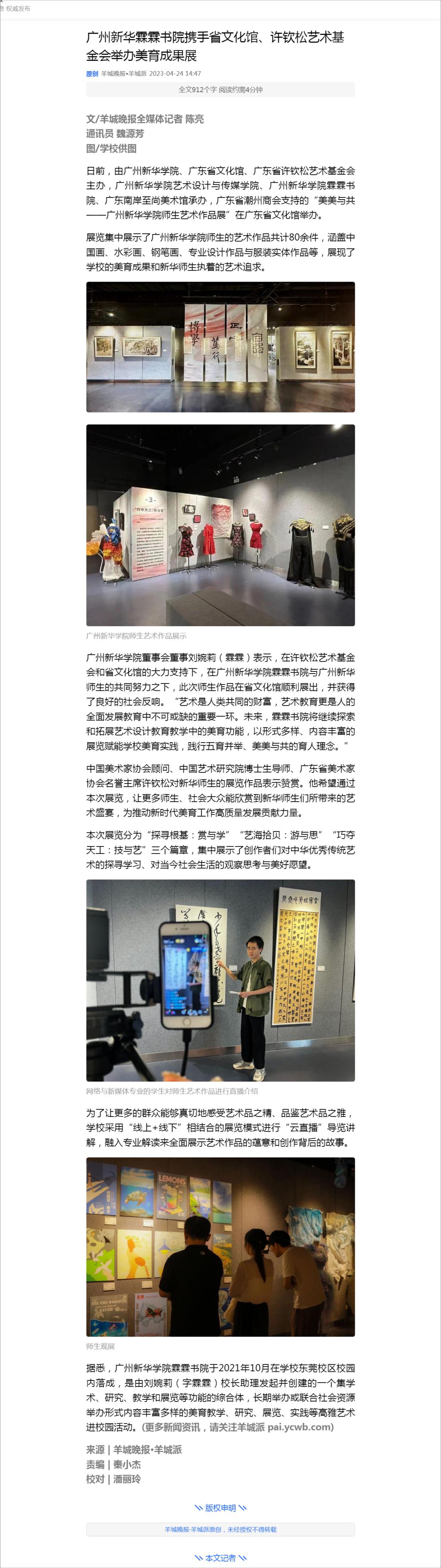 中国美术家协会顾问、中国艺术研究院博士生导师、广东省美术家协会名誉主席许钦松对新华师生的展览作品表示赞赏。他希望通过本次展览,让更多师生、社会大众能欣赏到新华师生们所带来的艺术盛宴,为推动新时代美育工作高质量发展贡献力量。