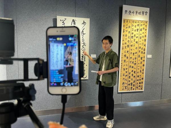 网络与新媒体专业的学生对师生艺术作品进行直播介绍