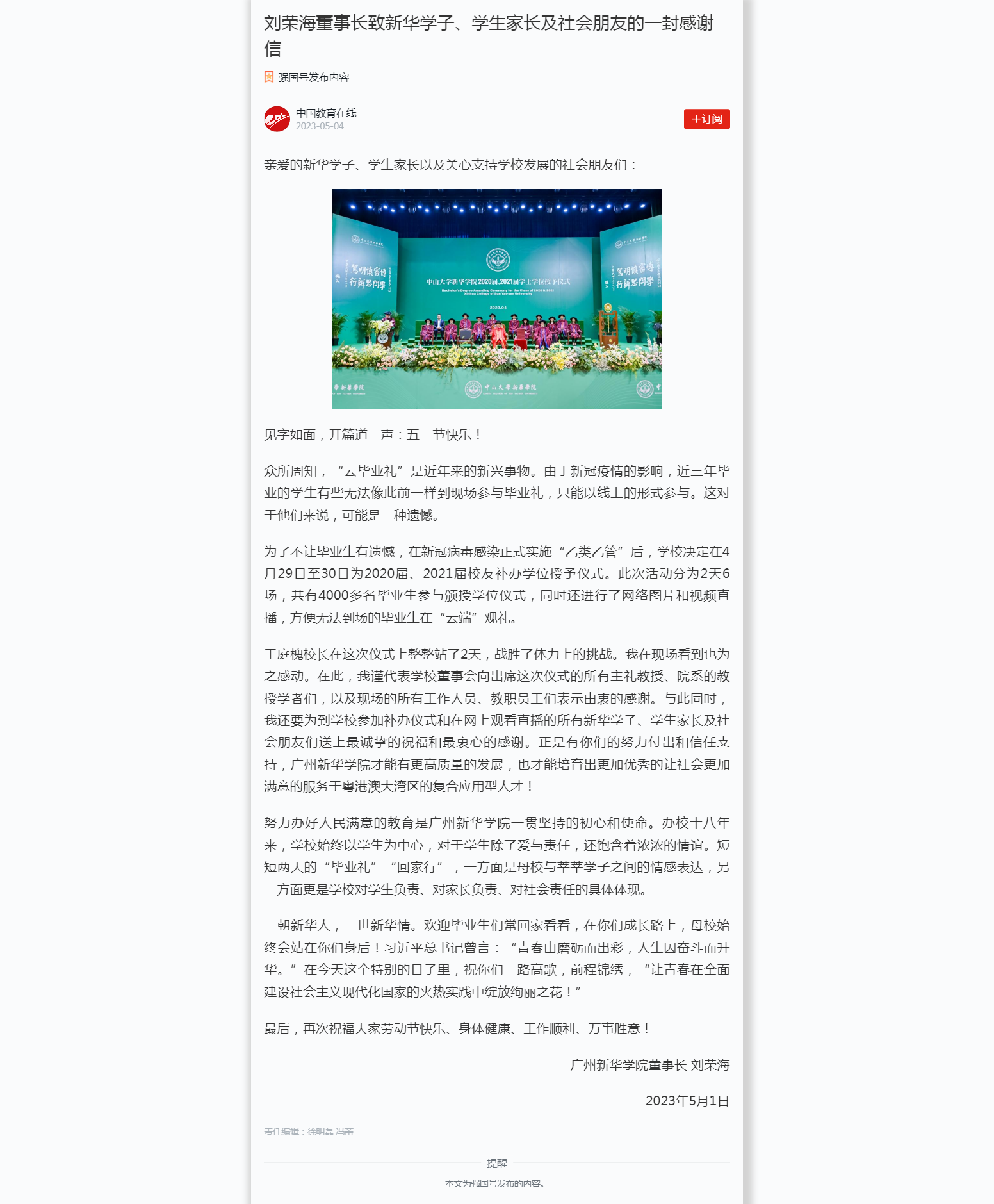 亲爱的新华学子、学生家长以及关心支持学校发展的社会朋友们: