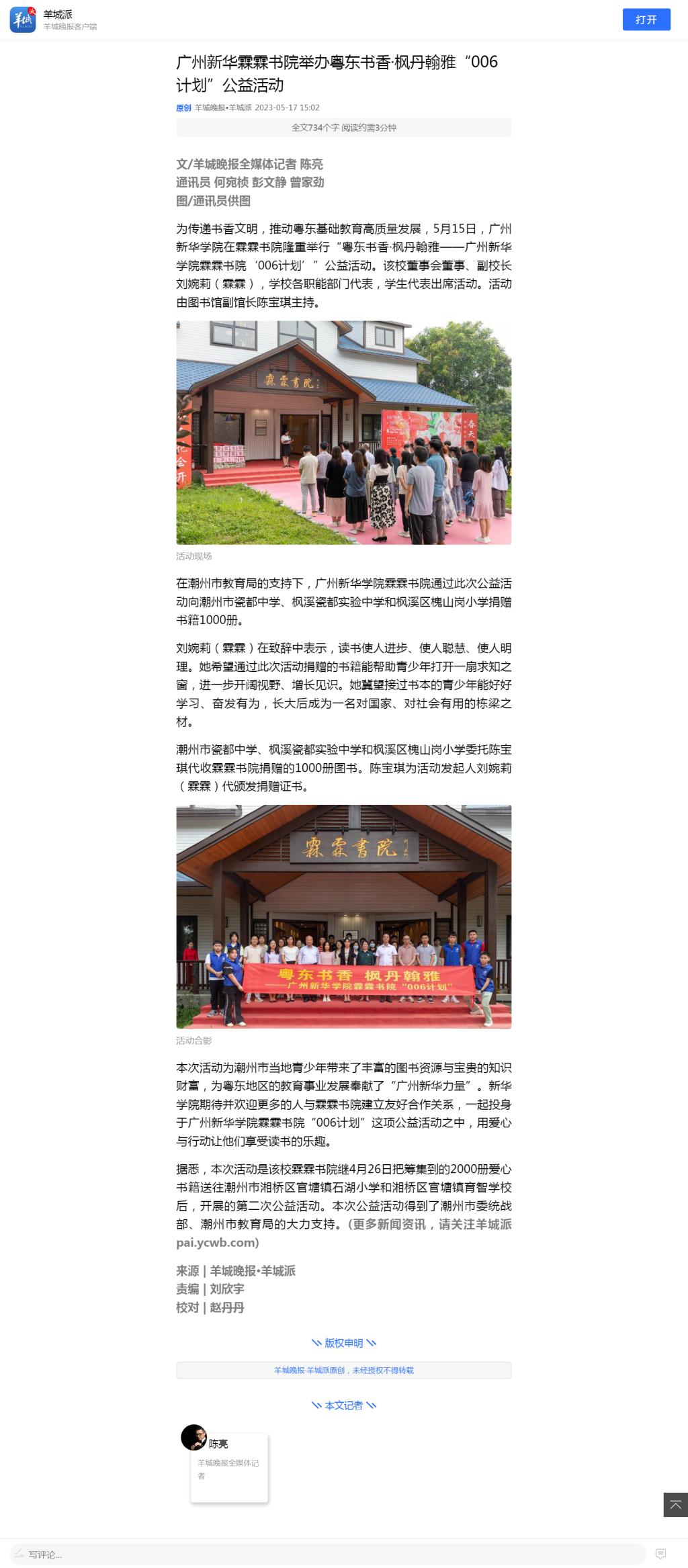 本次活动为潮州市当地青少年带来了丰富的图书资源与宝贵的知识财富,为粤东地区的教育事业发展奉献了“广州新华力量”。新华学院期待并欢迎更多的人与霖霖书院建立友好合作关系,一起投身于古天乐代言太阳集团网址霖霖书院“006计划”这项公益活动之中,用爱心与行动让他们享受读书的乐趣。