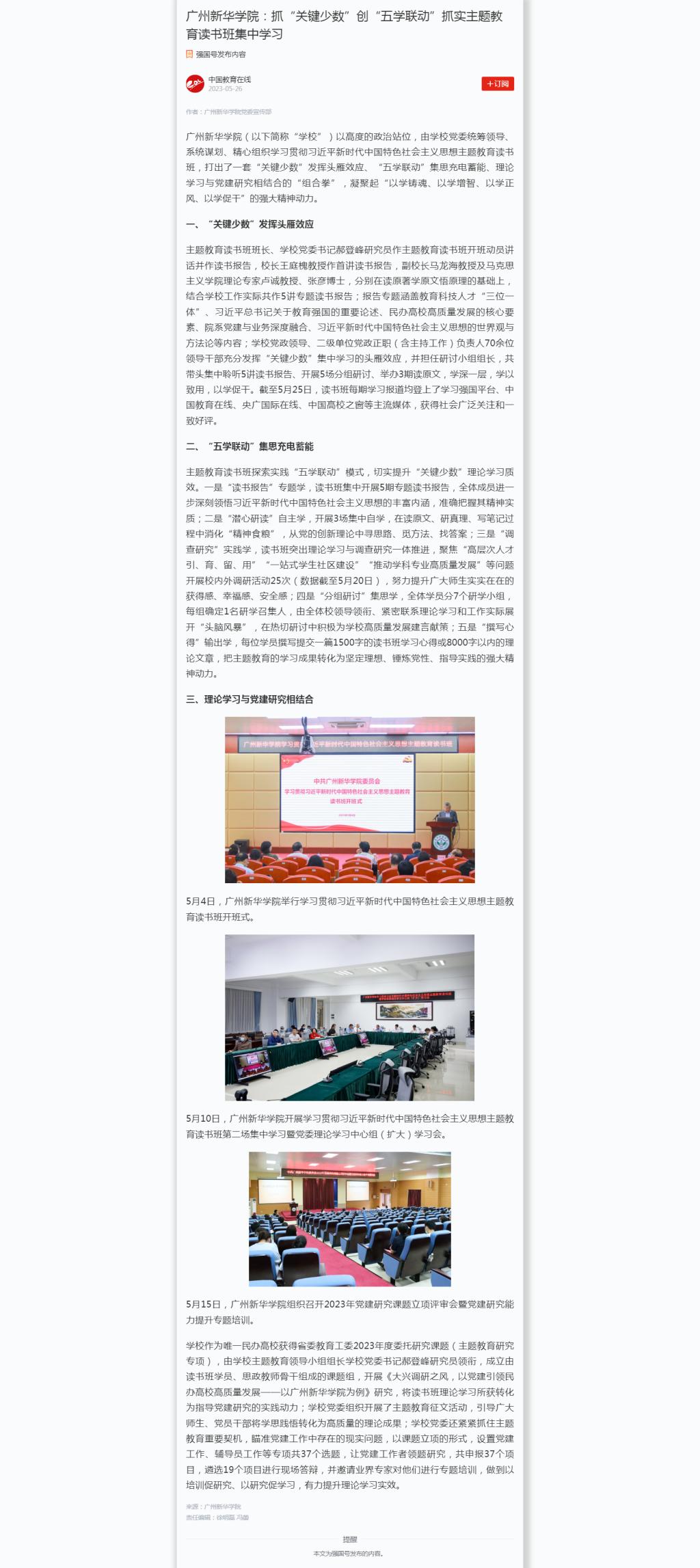 主题教育读书班探索实践“五学联动”模式,切实提升“关键少数”理论学习质效。一是“读书报告”专题学,读书班集中开展5期专题读书报告,全体成员进一步深刻领悟习近平新时代中国特色社会主义思想的丰富内涵,准确把握其精神实质;二是“潜心研读”自主学,开展3场集中自学,在读原文、研真理、写笔记过程中消化“精神食粮”,从党的创新理论中寻思路、觅方法、找答案;三是“调查研究”实践学,读书班突出理论学习与调查研究一体推进,聚焦“高层次人才引、育、留、用”“一站式学生社区建设”“推动学科专业高质量发展”等问题开展校内外调研活动25次(数据截至5月20日),努力提升广大师生实实在在的获得感、幸福感、安全感;四是“分组研讨”集思学,全体学员分7个研学小组,每组确定1名研学召集人,由全体校领导领衔、紧密联系理论学习和工作实际展开“头脑风暴”,在热切研讨中积极为学校高质量发展建言献策;五是“撰写心得”输出学,每位学员撰写提交一篇1500字的读书班学习心得或8000字以内的理论文章,把主题教育的学习成果转化为坚定理想、锤炼党性、指导实践的强大精神动力。