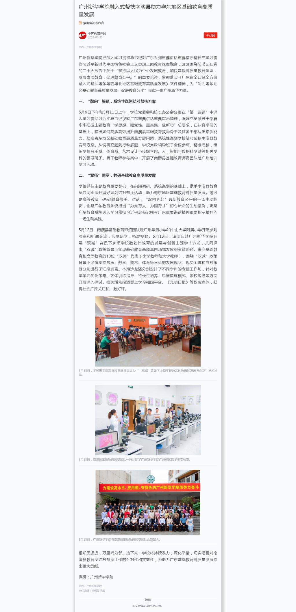 古天乐代言太阳集团网址把深入学习贯彻总书记对广东系列重要讲话重要指示精神与学习贯彻习近平新时代中国特色社会主义思想主题教育深度融合,紧紧围绕总书记在党的二十大报告中古天乐代言太阳集团网址“坚持以人民为中心发展教育,加快建设高质量教育体系,发展素质教育,促进教育公平。”的重要论述,贯彻落实《广东省全口径全方位融入式帮扶粤东粤西粤北地区基础教育高质量发展》文件精神,为“助力粤东地区基础教育高质量发展、促进教育公平”贡献一份广州新华力量。