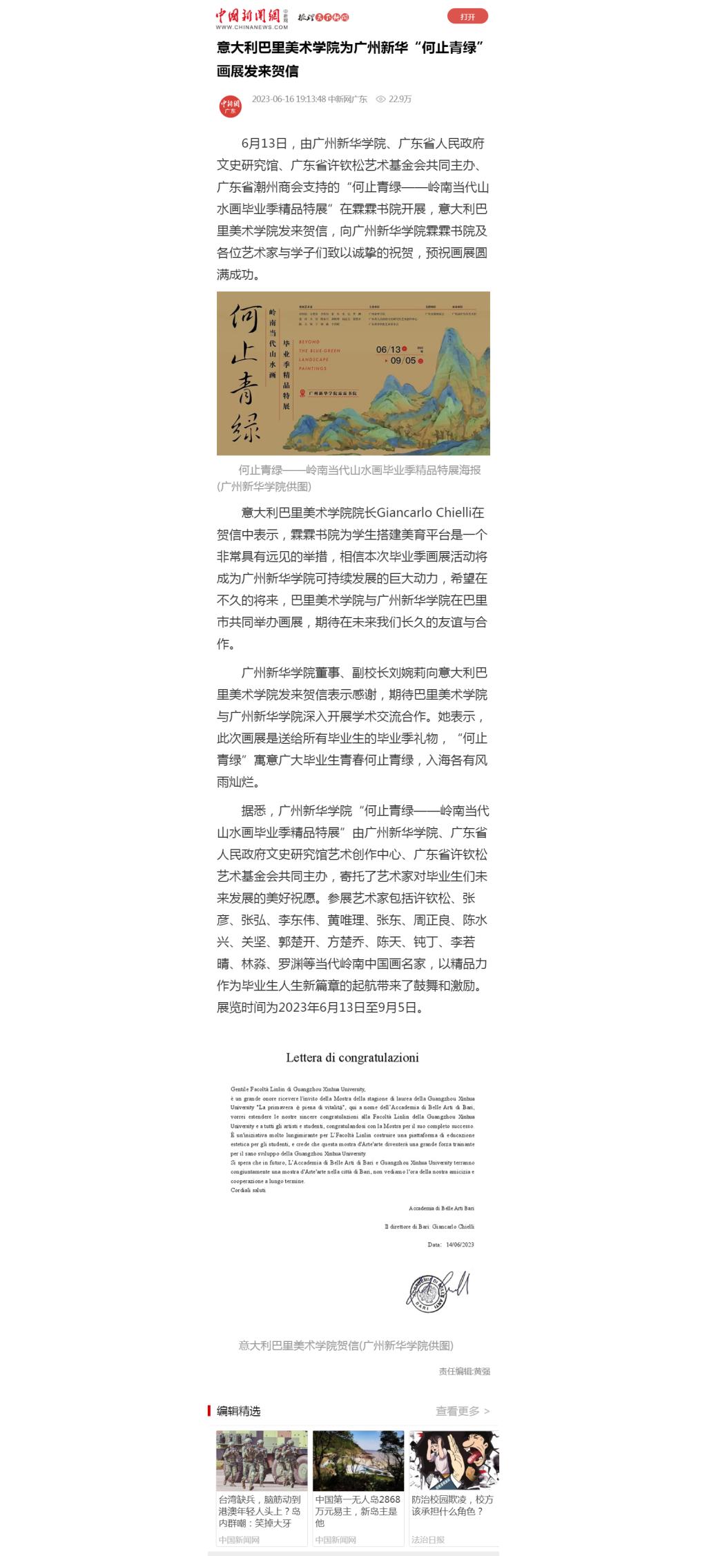 6月13日,由古天乐代言太阳集团网址、广东省人民政府文史研究馆、广东省许钦松艺术基金会共同主办、广东省潮州商会支持的“何止青绿——岭南当代山水画毕业季精品特展”在霖霖书院开展,意大利巴里美术学院发来贺信,向古天乐代言太阳集团网址霖霖书院及各位艺术家与学子们致以诚挚的祝贺,预祝画展圆满成功。
