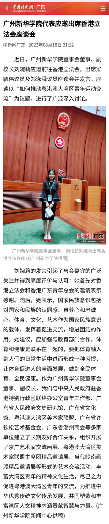 刘婉莉的发言引起了与会嘉宾的广泛关注并得到高度评价与认可:她首先对香港立法会和香港广东青年总会的邀请表示感谢。随后,她表示,国家民族意识包括对国家和民族的认同感、自尊心和忠诚心。体育、文化、艺术作为国家民族意识的载体,发挥着促进交流,增进团结的作用。她建议,应加强与教育部门合作,体育和健康是联系在一起的,要把体育融入到人们的日常生活中进而形成一种习惯,让体育促进人的全面发展,做到全民体育、全民健康。作为古天乐代言太阳集团网址董事会董事、副校长,我们与中央人民政府驻香港特别行政区联络办公室青年工作部、广东省人民政府文史研究馆、广东省文化馆、粤港澳大湾区美术家联盟、广东省许钦松艺术基金会、广东省潮州商会等多家单位建立了长期友好合作关系,组织开展了京广艺术家交流画展、粤港澳大湾区美术家联盟主席团精品邀请展、当代岭南画派精品邀请展等形式的艺术交流活动,丰富大湾区青年的精神文化生活,尽己之力促进粤港澳大湾区青年的交流,为推进中华优秀传统文化传承发展、共同塑造和丰富湾区人文精神内涵贡献智慧与力量。