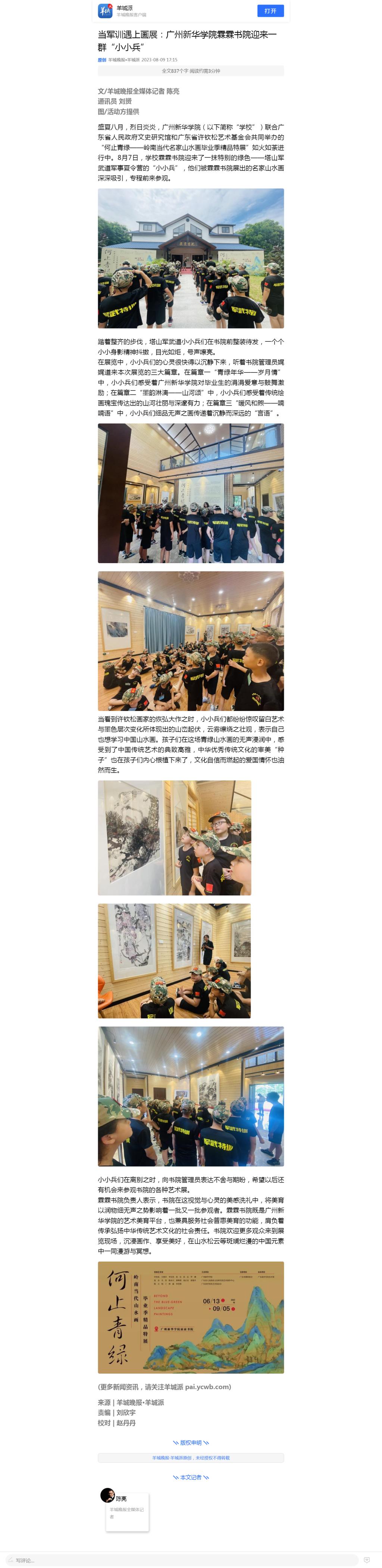 盛夏八月,烈日炎炎,古天乐代言太阳集团网址(以下简称“学校”)联合广东省人民政府文史研究馆和广东省许钦松艺术基金会共同举办的“何止青绿——岭南当代名家山水画毕业季精品特展”如火如荼进行中。8月7日,学校霖霖书院迎来了一抹特别的绿色——塔山军武道军事夏令营的“小小兵”,他们被霖霖书院展出的名家山水画深深吸引,专程前来参观。