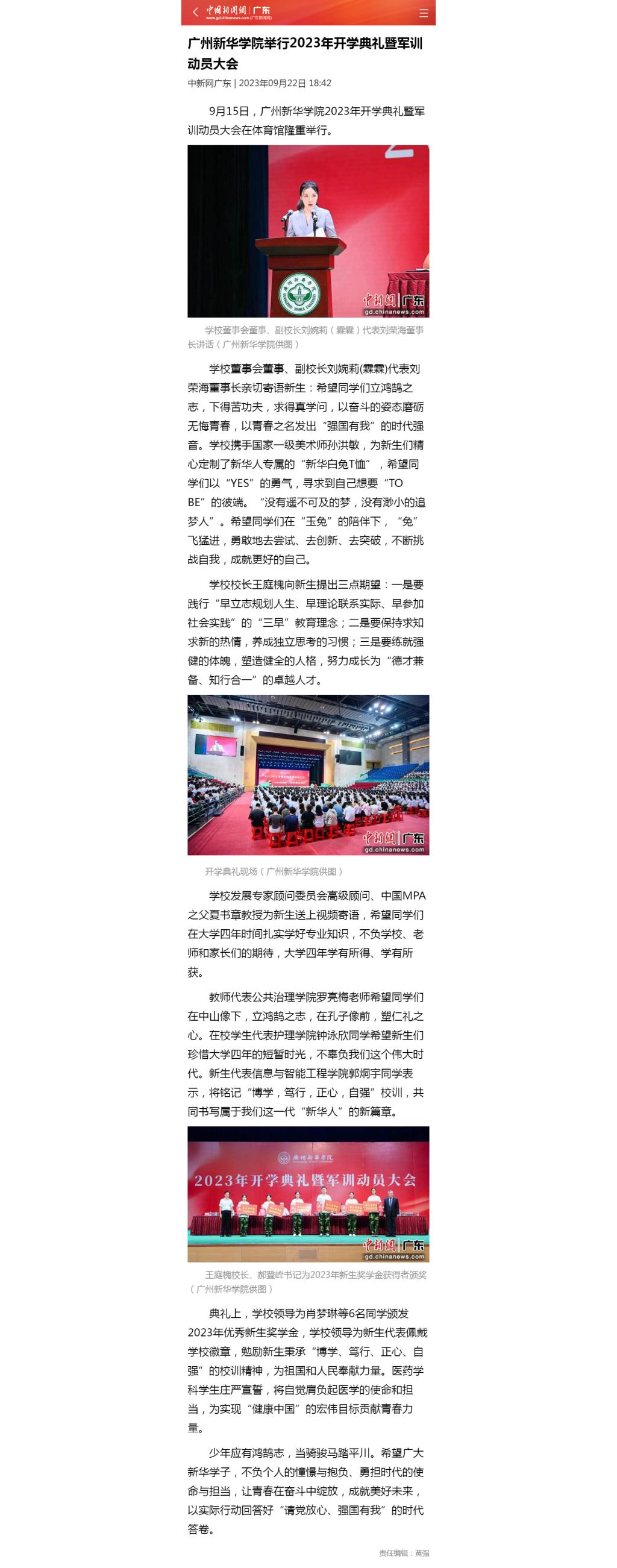 教师代表公共治理学院罗亮梅老师希望同学们在中山像下,立鸿鹄之志,在孔子像前,塑仁礼之心。在校学生代表护理学院钟泳欣同学希望新生们珍惜大学四年的短暂时光,不辜负我们这个伟大时代。新生代表信息与智能工程学院郭烔宇同学表示,将铭记“博学,笃行,正心,自强”校训,共同书写属于我们这一代“新华人”的新篇章。