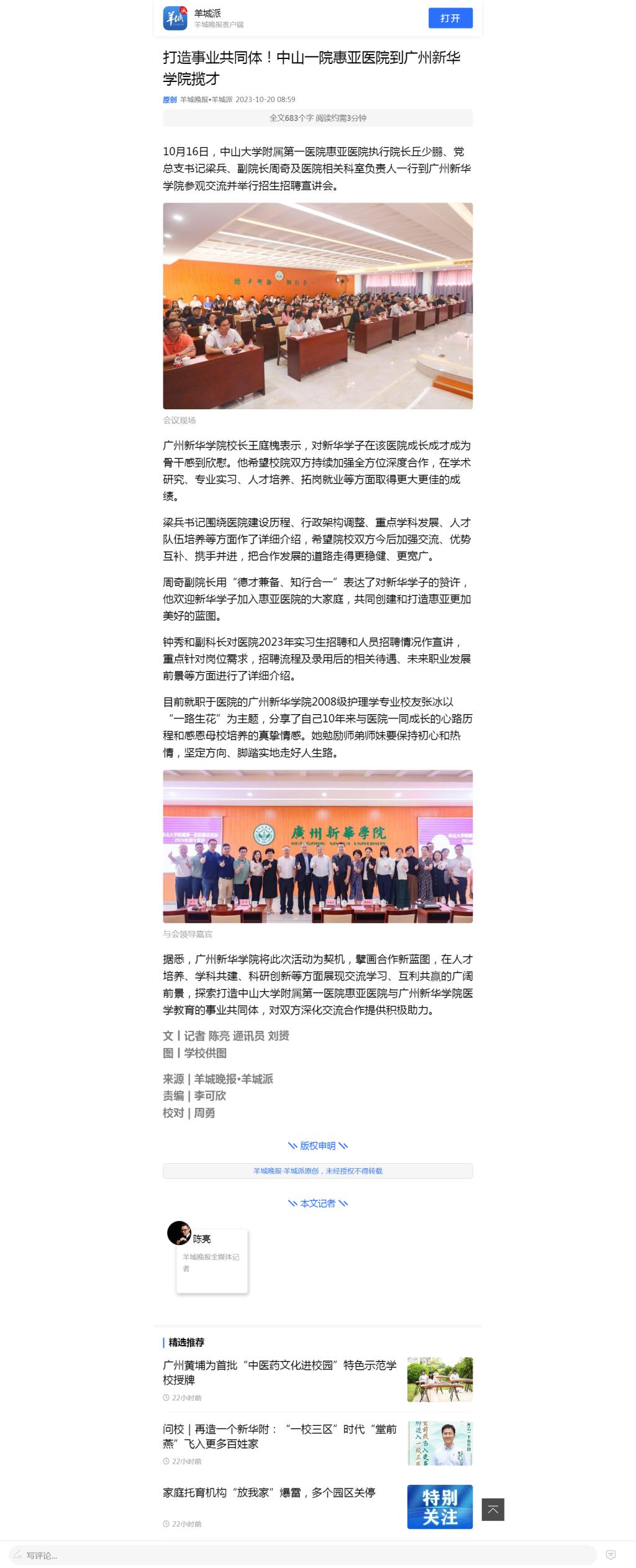10月16日,中山大学附属第一医院惠亚医院执行院长丘少鹏、党总支书记梁兵、副院长周奇及医院相关科室负责人一行到古天乐代言太阳集团网址参观交流并举行招生招聘宣讲会。