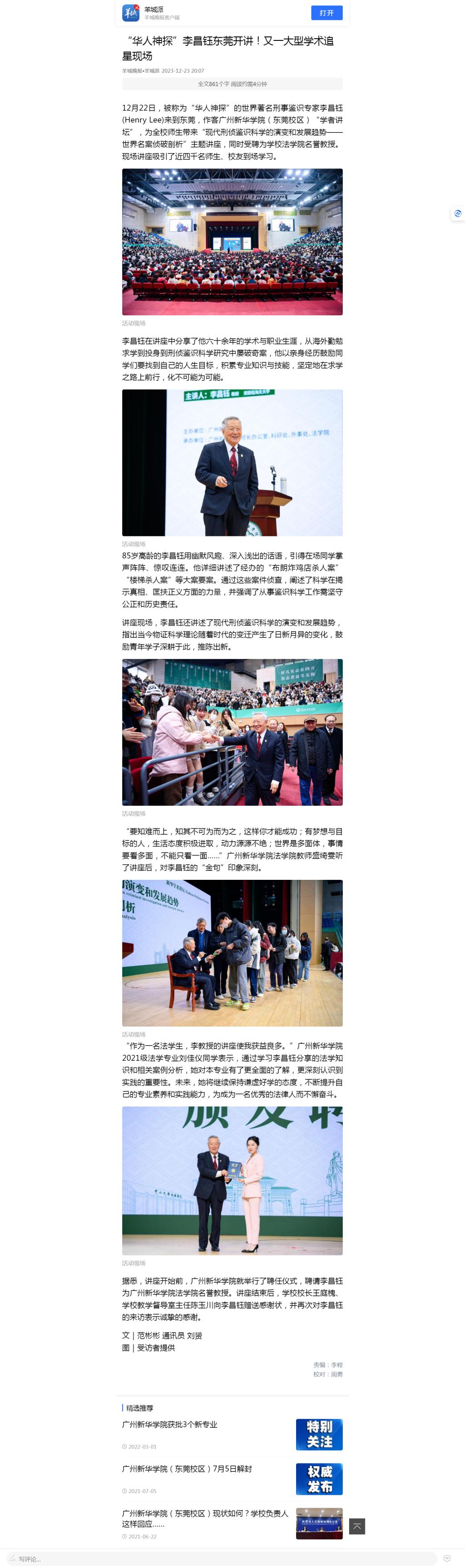 12月22日,被称为“华人神探”的世界著名刑事鉴识专家李昌钰(Henry Lee)来到东莞,作客古天乐代言太阳集团网址(东莞校区)“学者讲坛”,为全校师生带来“现代刑侦鉴识科学的演变和发展趋势——世界名案侦破剖析”主题讲座,同时受聘为学校法学院名誉教授。现场讲座吸引了近四千名师生、校友到场学习。