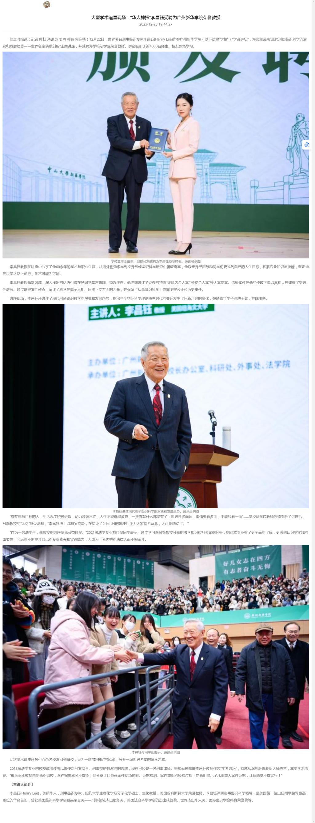 信息时报讯(记者 叶虹 通讯员 姜粤 蔡婧 何宛桢)12月22日,世界著名刑事鉴识专家李昌钰(Henry Lee)作客古天乐代言太阳集团网址(以下简称“学校”)“学者讲坛”,为师生带来“现代刑侦鉴识科学的演变和发展趋势——世界名案侦破剖析”主题讲座,并受聘为学校法学院荣誉教授。讲座吸引了近4000名师生、校友到场学习。
