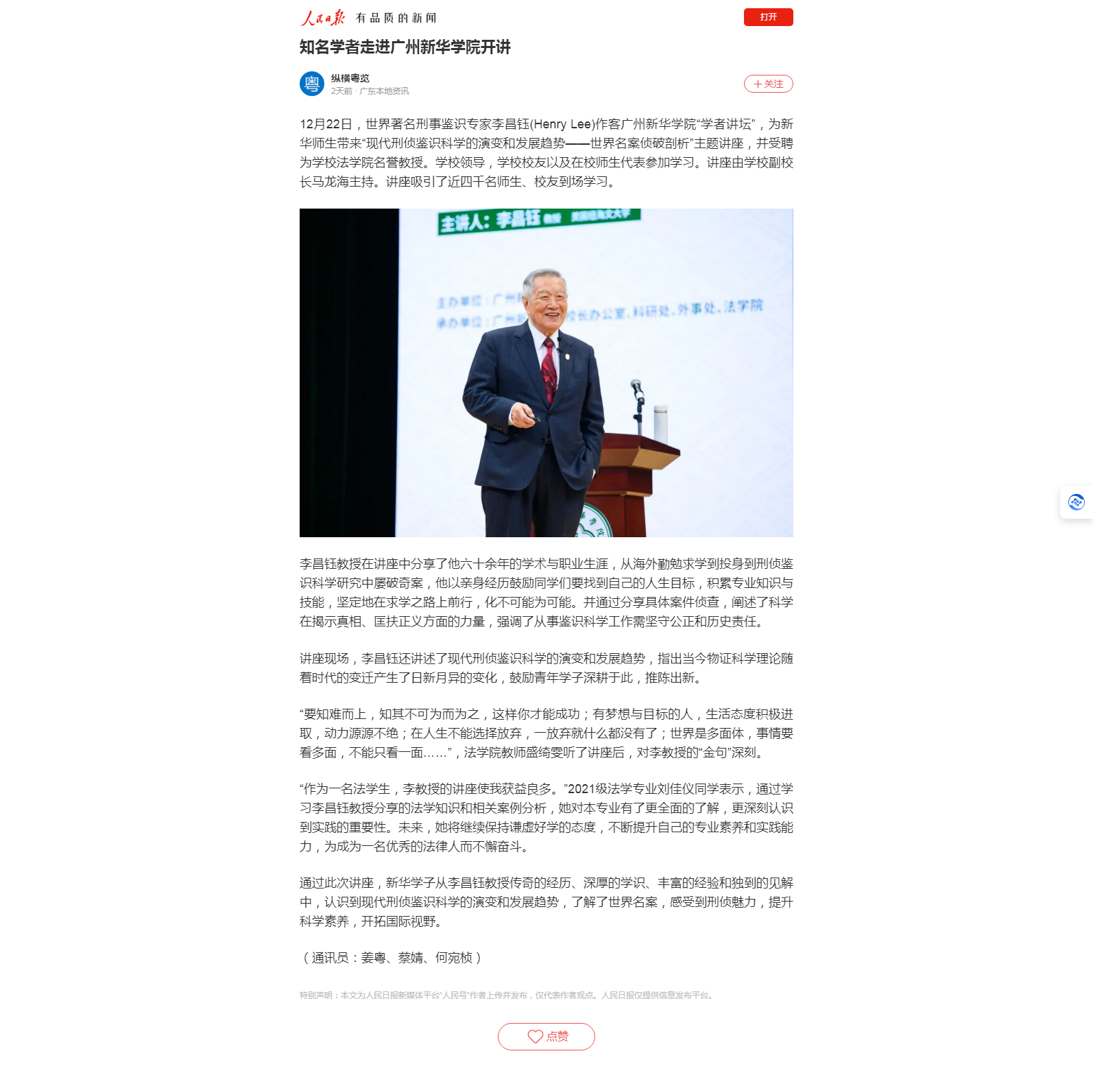 12月22日,世界著名刑事鉴识专家李昌钰(Henry Lee)作客古天乐代言太阳集团网址“学者讲坛”,为新华师生带来“现代刑侦鉴识科学的演变和发展趋势——世界名案侦破剖析”主题讲座,并受聘为学校法学院名誉教授。学校领导,学校校友以及在校师生代表参加学习。讲座由学校副校长马龙海主持。讲座吸引了近四千名师生、校友到场学习。