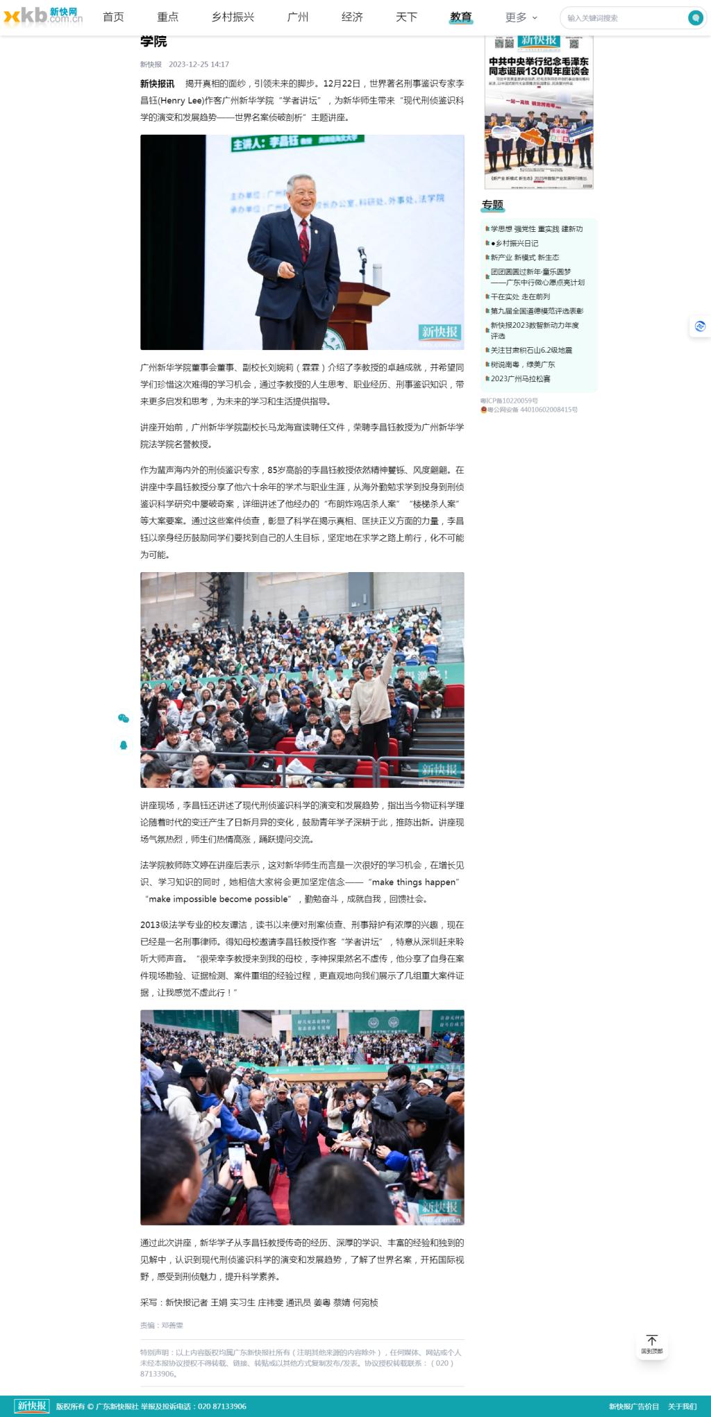 新快报讯 揭开真相的面纱,引领未来的脚步。12月22日,世界著名刑事鉴识专家李昌钰(Henry Lee)作客古天乐代言太阳集团网址“学者讲坛”,为新华师生带来“现代刑侦鉴识科学的演变和发展趋势——世界名案侦破剖析”主题讲座。