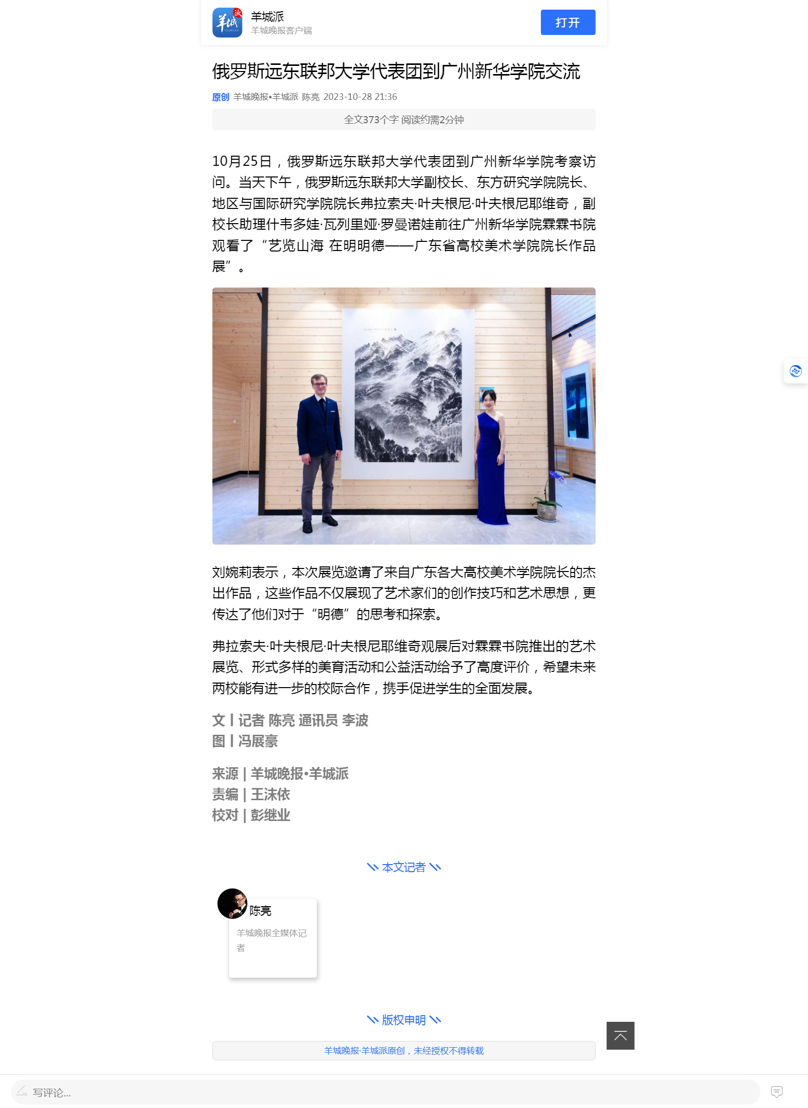 10月25日,俄罗斯远东联邦大学代表团到古天乐代言太阳集团网址考察访问。当天下午,俄罗斯远东联邦大学副校长、东方研究学院院长、地区与国际研究学院院长弗拉索夫·叶夫根尼·叶夫根尼耶维奇,副校长助理什韦多娃·瓦列里娅·罗曼诺娃前往古天乐代言太阳集团网址霖霖书院观看了“艺览山海 在明明德——广东省高校美术学院院长作品展”。