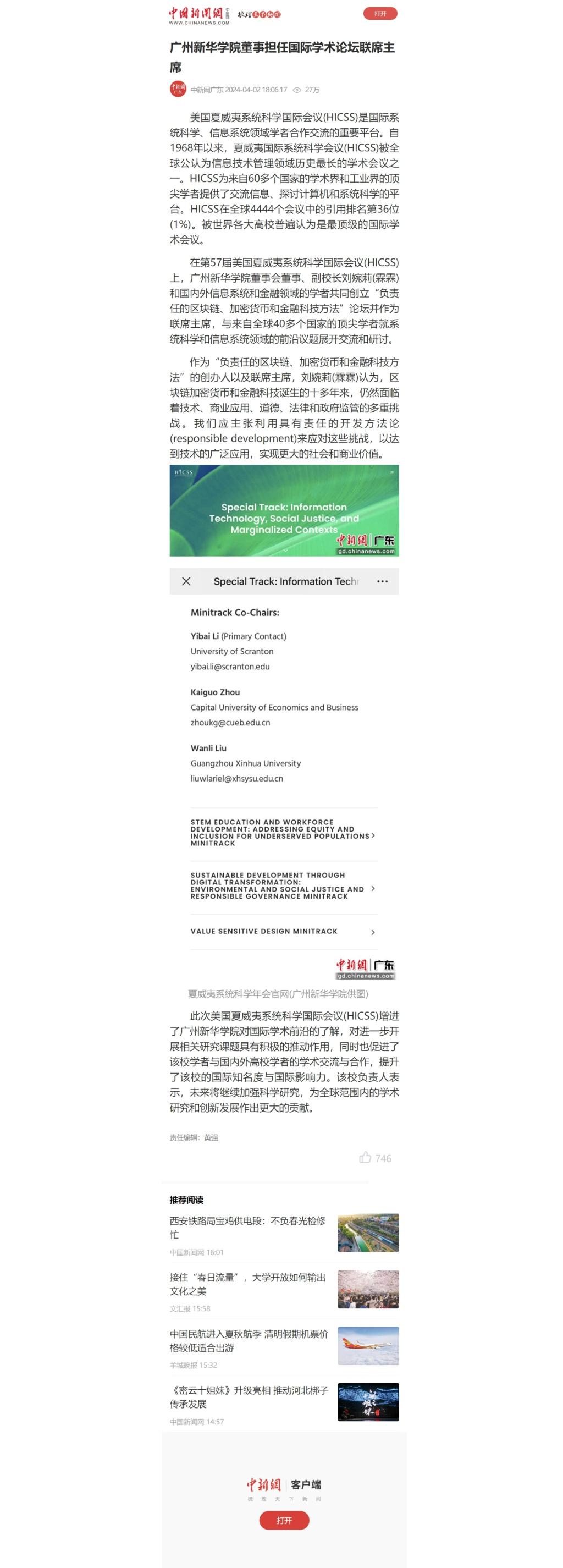 在第57届美国夏威夷系统科学国际会议(HICSS)上,古天乐代言太阳集团网址董事会董事、副校长刘婉莉(霖霖)和国内外信息系统和金融领域的学者共同创立“负责任的区块链、加密货币和金融科技方法”论坛并作为联席主席,与来自全球40多个国家的顶尖学者就系统科学和信息系统领域的前沿议题展开交流和研讨。