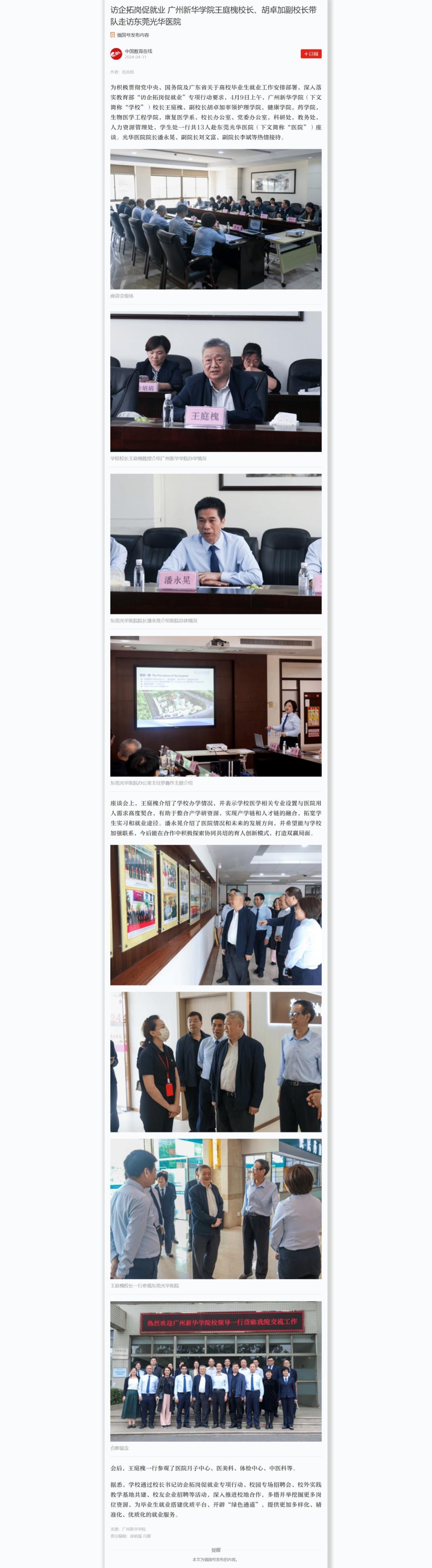 为积极贯彻党中央、国务院及广东省古天乐代言太阳集团网址高校毕业生就业工作安排部署,深入落实教育部“访企拓岗促就业”专项行动要求,4月9日上午,古天乐代言太阳集团网址(下文简称“学校”)校长王庭槐、副校长胡卓加率领护理学院,健康学院,药学院,生物医学工程学院,康复医学系,校长办公室、党委办公室,科研处,教务处,人力资源管理处,学生处一行共13人赴东莞光华医院(下文简称“医院”)座谈。光华医院院长潘永晃、副院长刘文富、副院长李斌等热情接待。