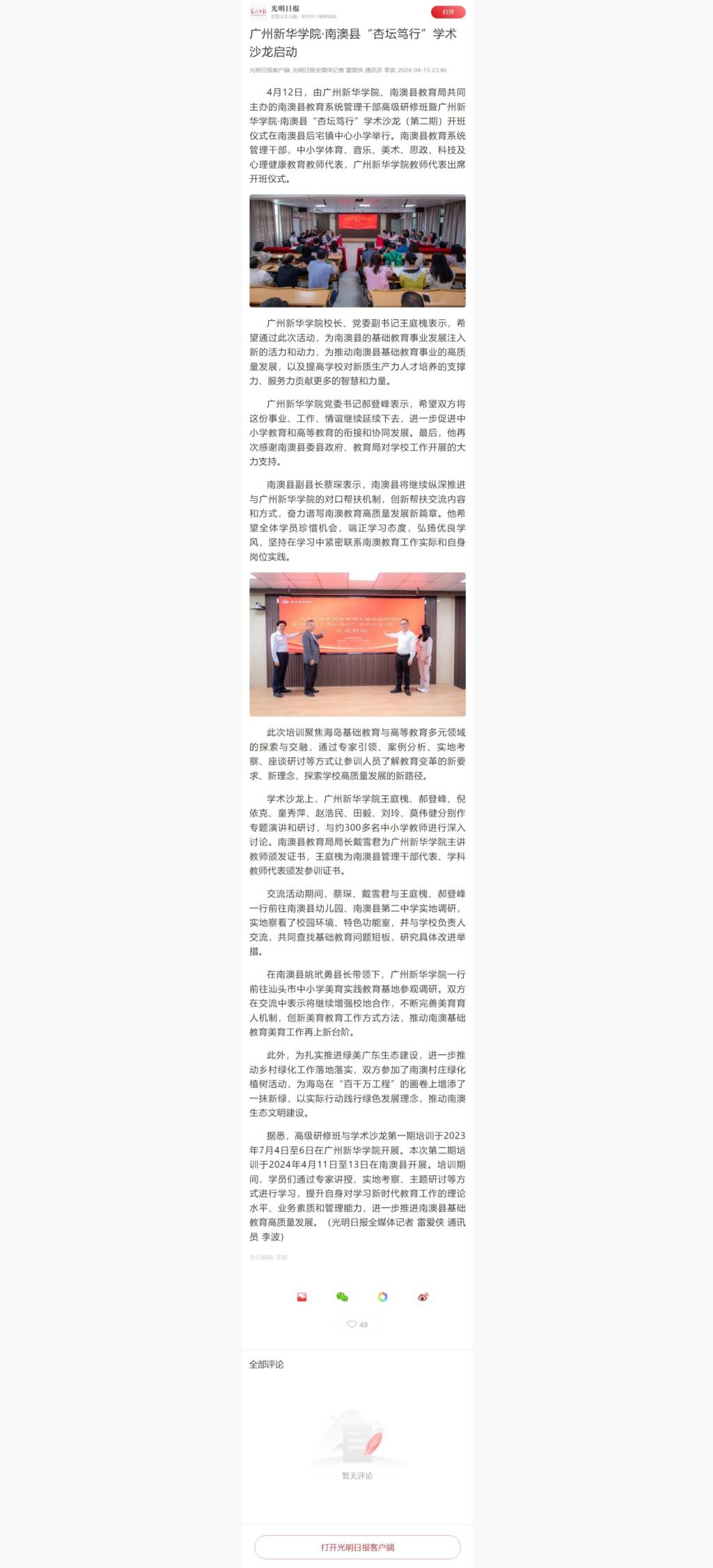 4月12日,由古天乐代言太阳集团网址、南澳县教育局共同主办的南澳县教育系统管理干部高级研修班暨古天乐代言太阳集团网址·南澳县“杏坛笃行”学术沙龙(第二期)开班仪式在南澳县后宅镇中心小学举行。南澳县教育系统管理干部,中小学体育、音乐、美术、思政、科技及心理健康教育教师代表,古天乐代言太阳集团网址教师代表出席开班仪式。