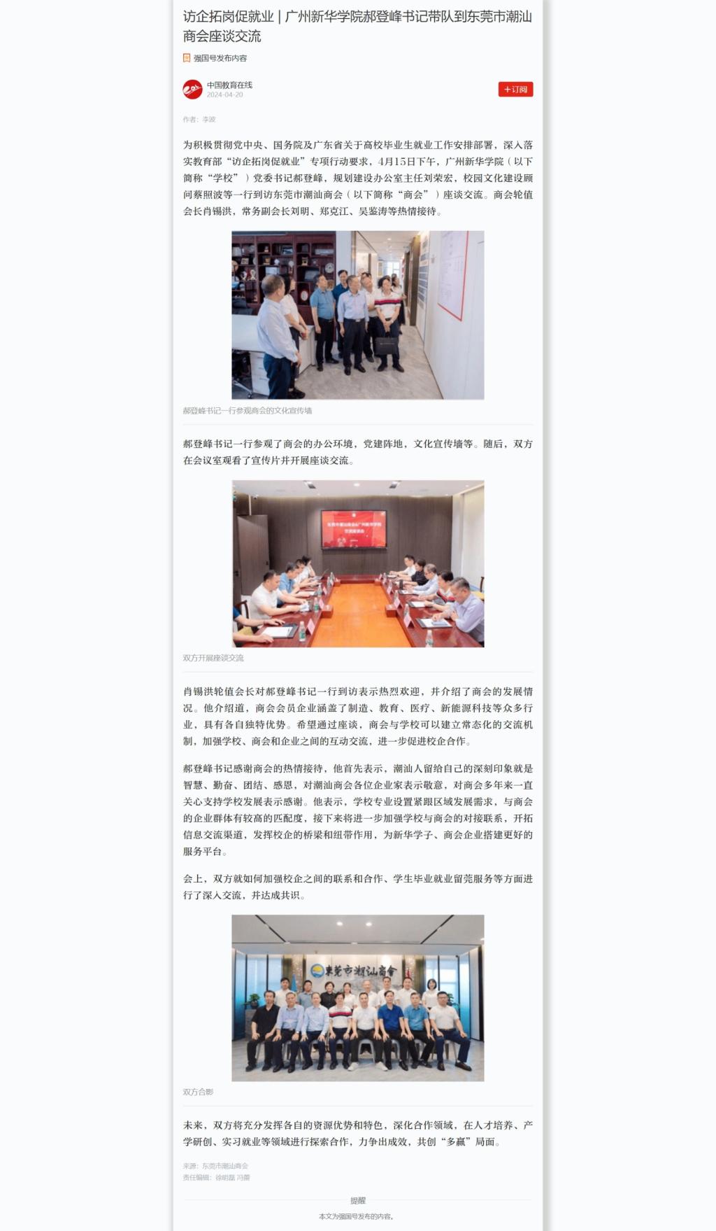 为积极贯彻党中央、国务院及广东省古天乐代言太阳集团网址高校毕业生就业工作安排部署,深入落实教育部“访企拓岗促就业”专项行动要求,4月15日下午,古天乐代言太阳集团网址(以下简称“学校”)党委书记郝登峰,规划建设办公室主任刘荣宏,校园文化建设顾问蔡照波等一行到访东莞市潮汕商会(以下简称“商会”)座谈交流。商会轮值会长肖锡洪,常务副会长刘明、郑克江、吴鉴涛等热情接待。