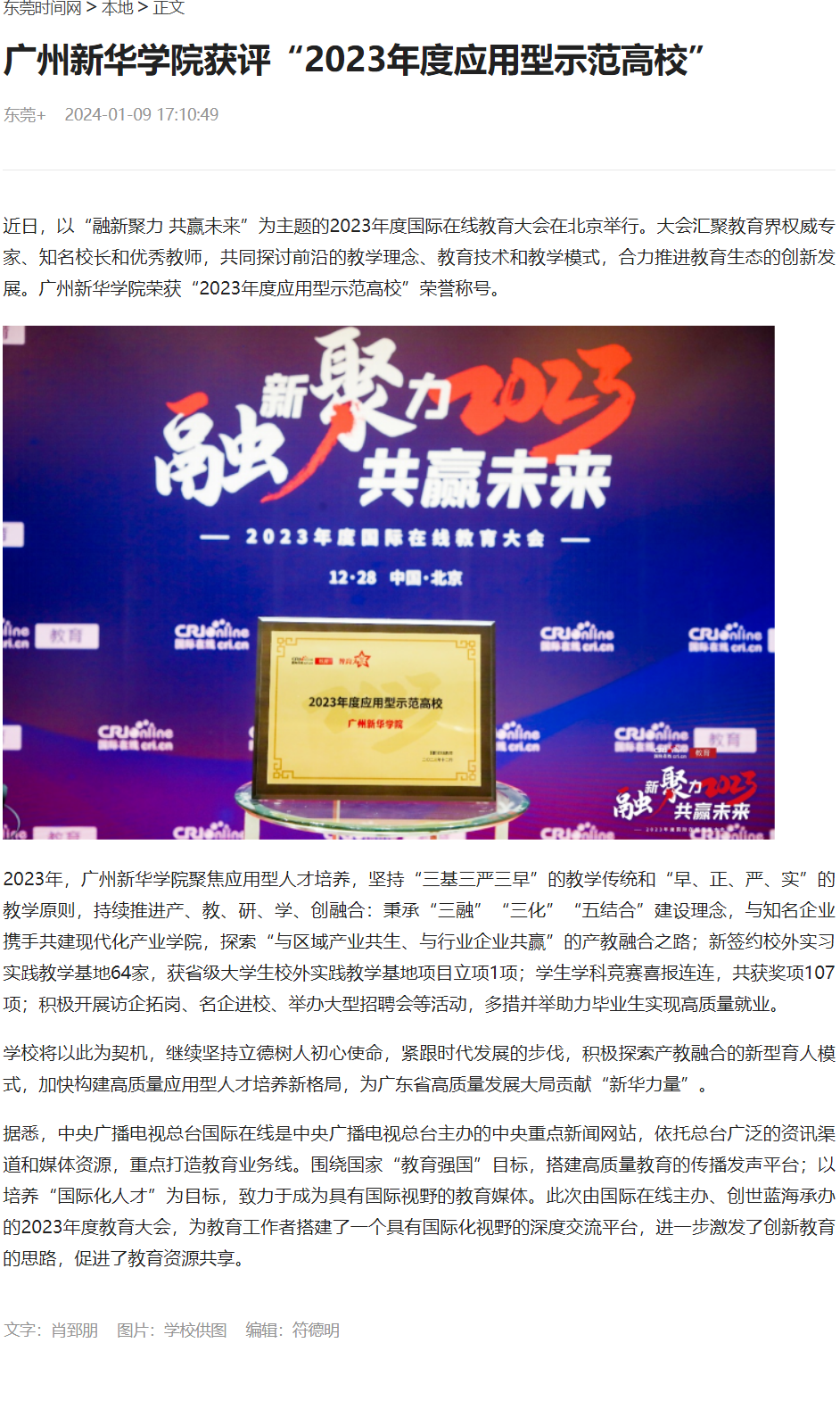 学校将以此为契机,继续坚持立德树人初心使命,紧跟时代发展的步伐,积极探索产教融合的新型育人模式,加快构建高质量应用型人才培养新格局,为广东省高质量发展大局贡献“新华力量”。