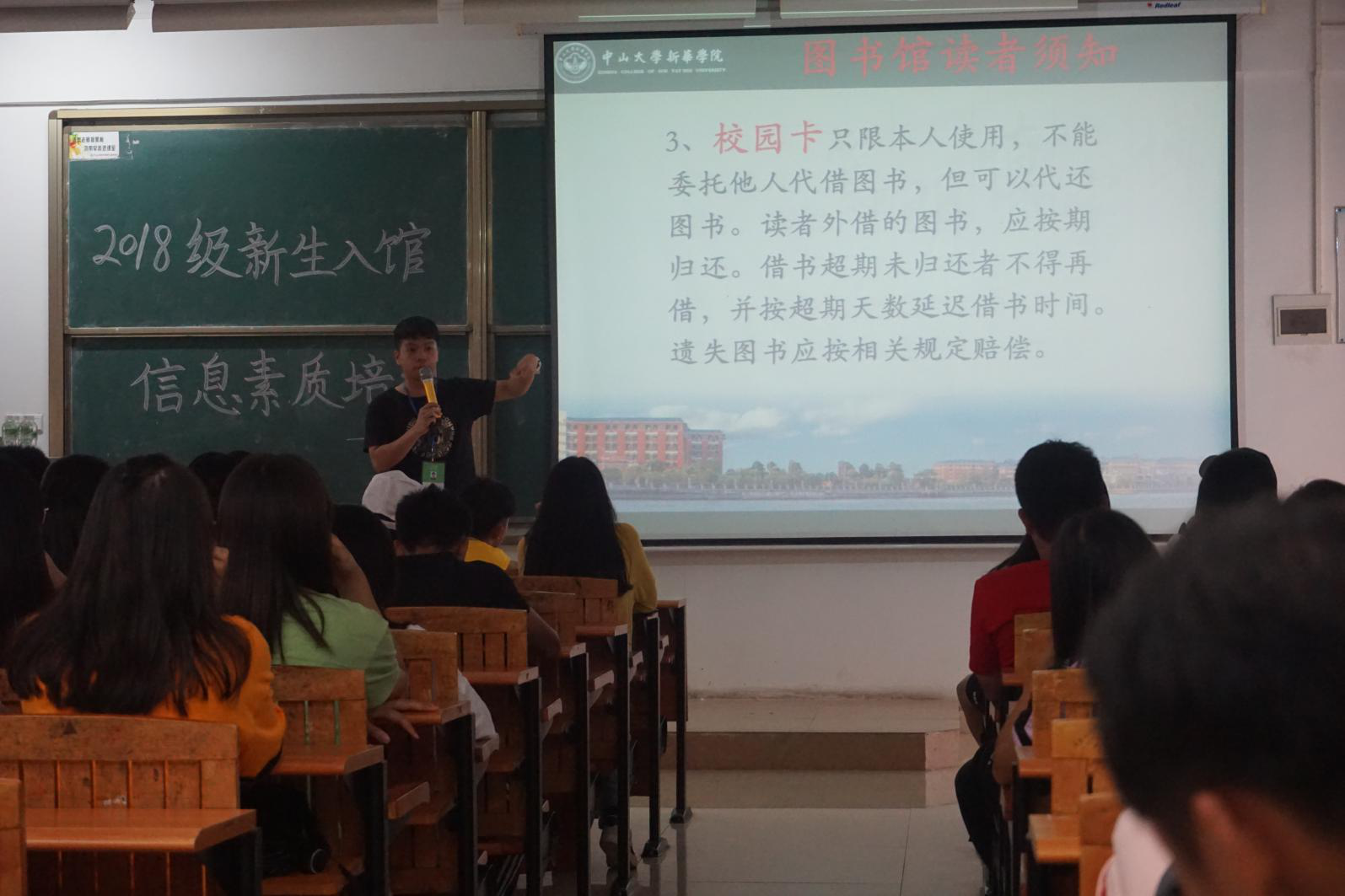 本次活动采用新生入馆参观和课室讲解的方式进行。在课室讲解环节中,图书馆工作人员从读者须知,开放时间,两校区图书馆各书库分布与结构,图书馆藏地点分布,图书分类,如何查找图书及网上预约、预借、续借,借还书规则,借书权限,中国知网使用及图书各类资源使用及共享中山大学图书馆资源使用操作方法共十个方面向新生们作培训。