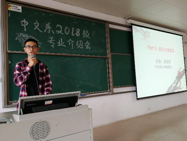 最后,由2018级新生代表吴其轩同学发表演讲。他的演讲也许是在座同学的心声:演讲里有对大学的迷茫,也有敲碎迷茫那一刻的欣喜;有选择中文专业的来由,也有对中文专业未来去向的感想。大学,一个全新起点,一个十字路口中心,“我将往哪里去”这个问题是他个人的感悟,也引起了很多新生的思考。