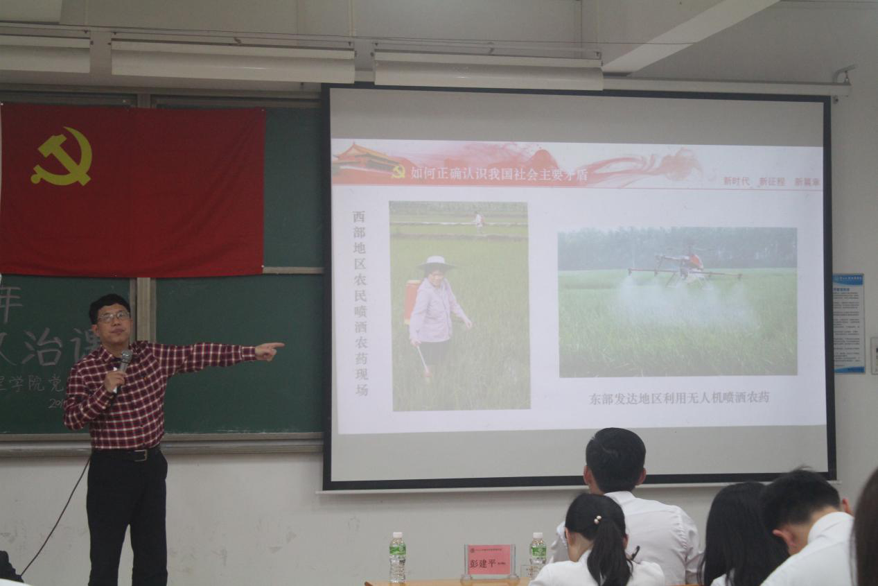 管理学院党总支书记彭建平教授围绕“新时期我国社会主要矛盾发生变化的新特点”这个话题展开授课,彭教授的授课深入浅出,结合事例和自身的经历说明各个时期经济和教育资源发展不平衡的问题,并精辟地阐述了当前我国的矛盾问题,同时要求大家准确理解“变与不变”的关系。彭院长的精彩演讲引起现场阵阵掌声,学生们聚精会神地聆听并认真做笔记,纷纷表示获益良多。