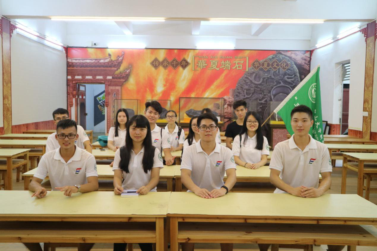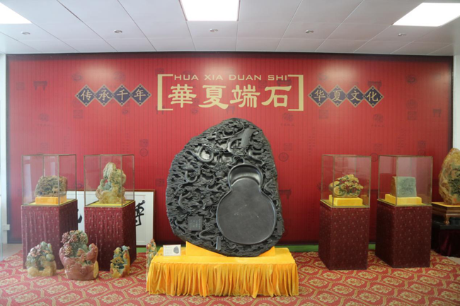 采访完端砚协会后,我们到“华夏端石”进行参观。工作人员给我们介绍了放置于中间位置的“九龙戏宝”——1996年最大的老坑端砚,还给我们教授了如何赏石和品石。精美的端砚作品让同学们叹为观止,琳琅满目的展示品让同学们大饱眼福;还有开设的以端砚学习为主的国学学堂,工作人员的科普让同学们受益匪浅,真是不虚此行。