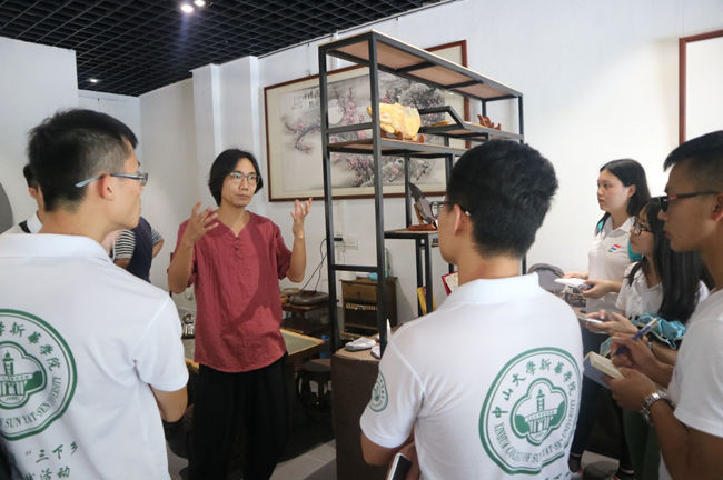 下午队员们前往位于白石村的“研砚”工作室去拜访了梁志勇师兄。梁志勇师兄2011年毕业于汕头大学,学的是数字媒体设计专业,毕业后一年多后回到肇庆开始从事与端砚有关的工作,并在今年年初与合伙人开设了自己的工作室,主要给那些还没有能力开设属于自己工作室的年轻人来展示他们自己的作品,意义在于鼓励更多年轻人在继承传统端砚文化的同时又能有所创新。