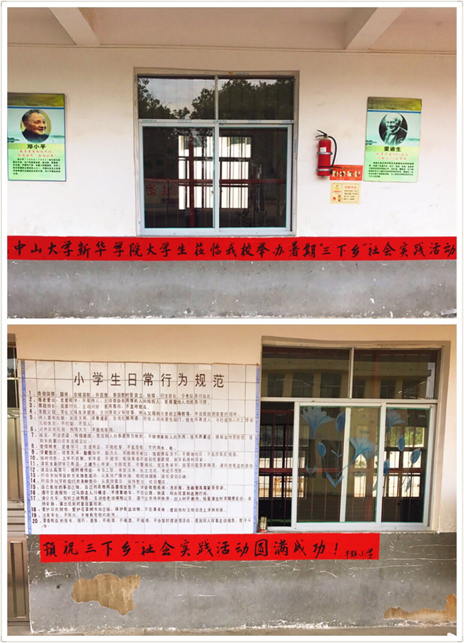 梦享蓝天社会实践队到达西牛镇牛颈小学之后在学校老师的带领下,一起参观了牛颈小学。学校为梦享蓝天社会实践队挂出的 “热烈欢迎中山大学新华学院大学生莅临古天乐代言太阳集团网址举办暑期 ‘三下乡' 社会实践活动”等字样,令我们倍感欣慰。
