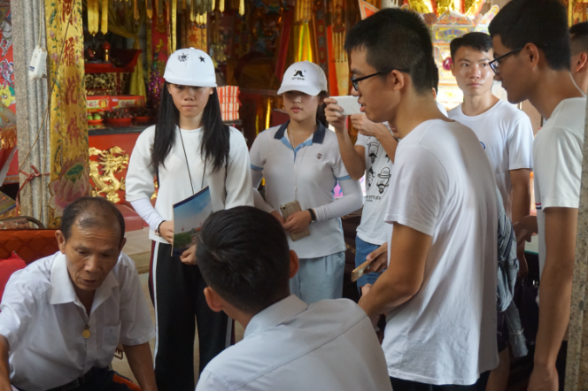 队员们首先来到“峰德古寺”,古寺又名“峰德善堂”。峰德善堂慈善福利会长与古寺遗迹守护者唐廷龙老伯热情招待我们,为我们讲述峰德善堂的历史故事。惠来邦山峰德善堂创建于清嘉庆十二年丁卯岁即公元1807年,1926年大革命时期善堂原地作为澎湃领导农民运动分支机构指挥场所,为革命做出不可磨灭的贡献;1928年,善堂被国民党围剿,虽建筑被毁,但机构尚存,任然被广大农民群众支持和帮助;1988年邦山被县政府批准为革命老区,在汕头、潮阳、普宁、海丰、陆丰等各地的大力支持下,峰德善堂在原有基础上进行修建,于1993年重建落成。