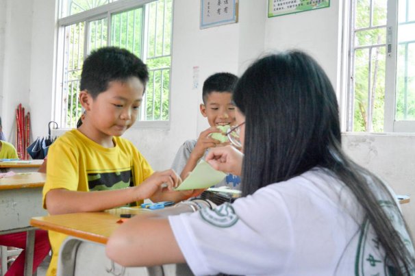 老师为学生讲解如何剪剪纸