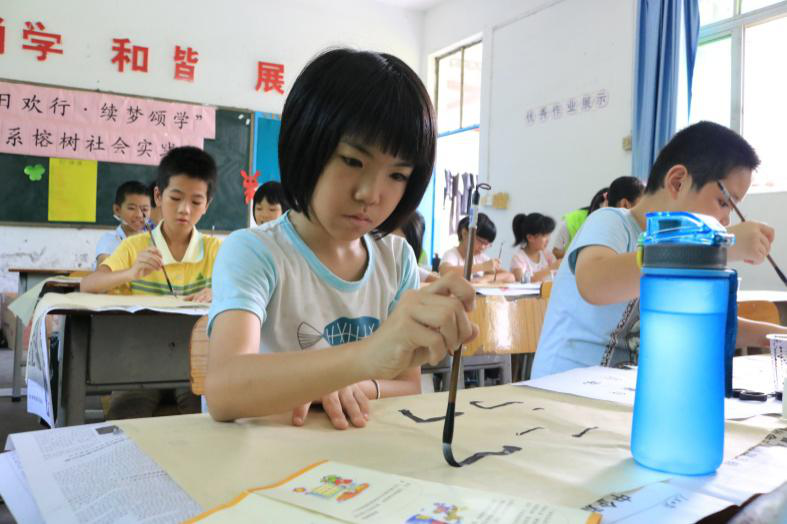 老师教我们“永字八法”练字诀,“侧”、“勒”、“努”、“趯”、“策”、“掠”、“啄”、“磔”。练好八字诀,也就练好了软笔书法的基本点画和写法。中国传统的书法文化,正需要这些朝气蓬勃的小朋友们来弘扬和发展。