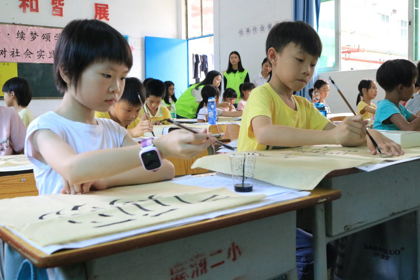7月17日,队员们给孩子们讲解了国学经典教育之《趣味汉字》课和武术课。