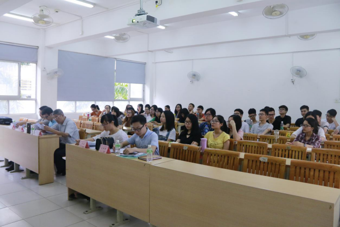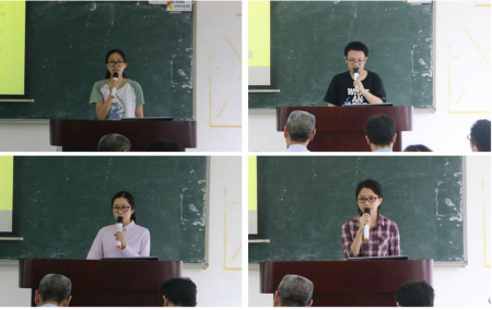 答辩会上,八名学生代表依次上台对自己的论文进行简要概述,介绍论文的核心内容,并积极思考回答评委老师的问题。论文依次是胡玉仪的《可疑耳石症前庭功能分析及治疗效果评估》、郑航宇的《影响主观性耳鸣残余抑制实验的相关因素分析》、陈子慧的《早期和中晚期梅尼埃病的耳鸣特征比较研究》、林炎玲的《不同前庭功能损害的突聋患者的听力学特征分析》、冯天赐的《中耳手术术中听力监测和术后听力恢复相关性的初步探讨》、林卫的《纯音听阈正常耳鸣患者的ABR波形特征分析》、郑锦泉的《宽频声导抗于分泌性中耳炎的诊断价值》、温晓琳的《感音神经性聋患者听觉过敏》。