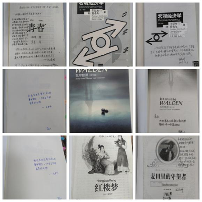 毕业班的师兄师姐在捐赠书上抒写留言,给学弟学妹们寄语