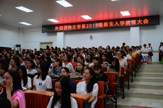 9月14日,外国语言文学系2016级新生入学教育大会在学院东莞校区召开。学院院长王庭槐亲临出席并致辞,欢迎2016级495名新生加入外语系大家庭。