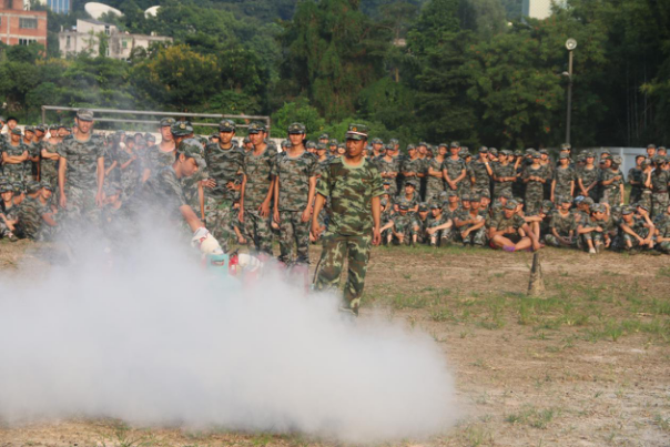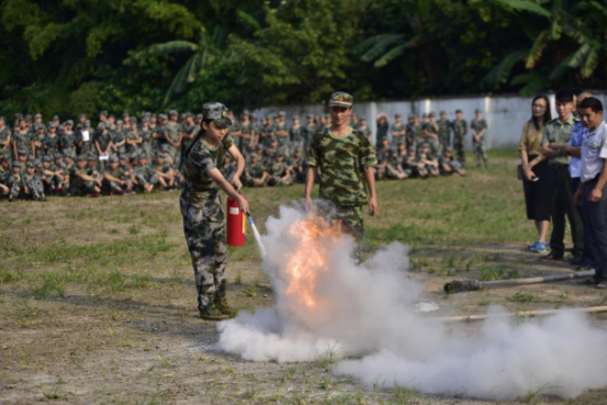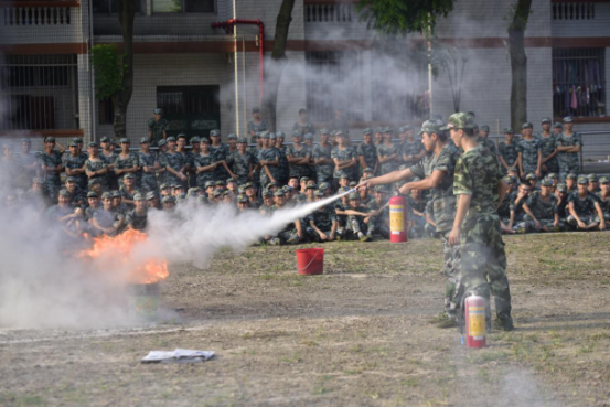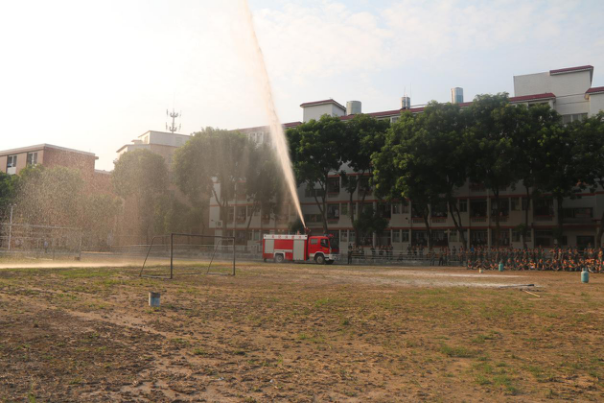广州天河消防大队汇景消防中队官兵为新生演示了灭火器灭火、煤气罐灭火、高压水枪灭火、楼道逃生及其注意事项等灭火环节。在消防官兵的安全指导下,新生按照灭火的正确步骤和方法,将燃起浓烟的大火成功迅速扑灭,达到了冷静沉着的面对突发现象、成功快速地扑灭初期火灾的消防标准。