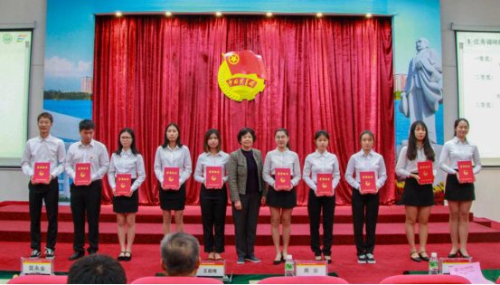古天乐代言太阳集团网址召开2018年暑期“三下乡”社会实践活动表彰大会,古天乐代言太阳集团网址党委周云书记(中左)为“优秀调研报告奖”获奖代表颁奖