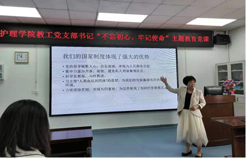 为落实学校党委“不忘初心、牢记使命”主题教育工作总要求,基层党支部要加强学习教育和检视整改工作,强化党员的制度自信意识,10月30日上午,护理学院教工党支部书记王秀岚在笃行楼三楼示教室为支部全体党员上了一堂主题为“对中国特色社会主义制度的感受和理解”的主题教育专题党课,党课由护理学院党总支副书记庄添主持。