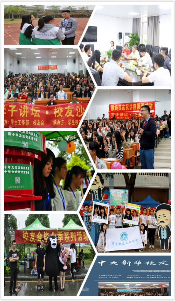 在服务母校方面,校友会充分发挥校友资源和校友力量,为母校发展建设添油助力。校友会发起为母校建造校园雕像的捐赠倡议,在两个校区建造四座名人雕像,为美丽校园景观增添靓丽的一笔;11级经济学专业官冬玲校友设立奖学金,激励在校生努力学习、为校争光;在“不忘初心、牢记使命”主题调研活动中,校友们积极建言献策,提出诸多宝贵建议,助力母校的人才培养建设;经营服装生意的11级市场营销专业刘家旋校友为母校捐赠几千件衣物等……年轻的中大新华校友们正在以自己的方式表达对母校的关心与关注,在校园文化、招生宣传、人才培养、合作共建等方面贡献自己的一份力量。